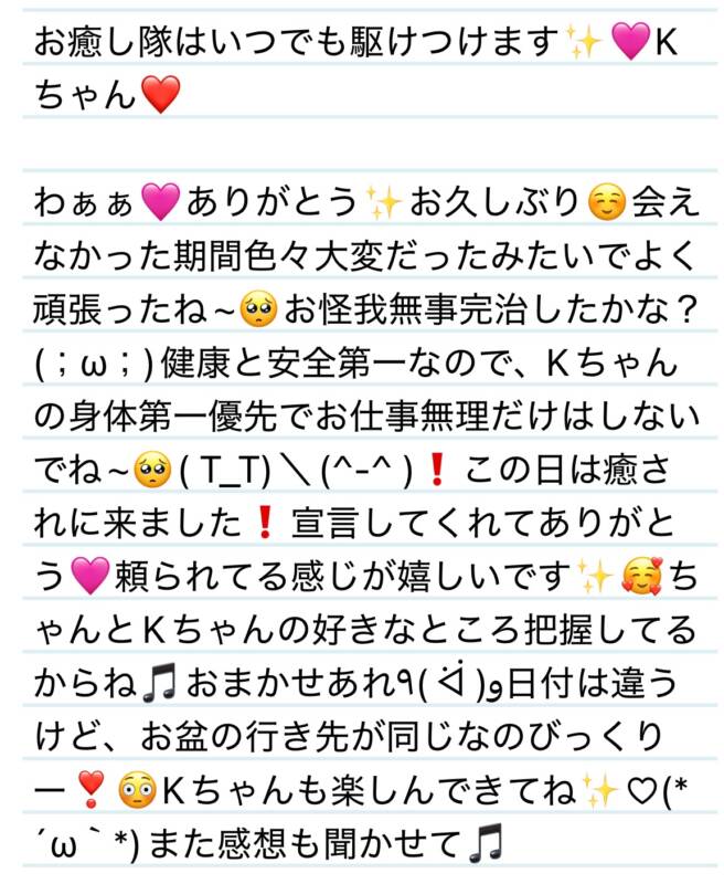11日 お癒し隊はいつでも駆けつけます✨🩷Kちゃん❤️ 2025 8/14 夢華 2025.08.14 北陸唯一!パフォーマンスに特化した「魅せる」メンズエステ 心身ともにリラックス。非日常的な極上のひと時を貴方に… お電話でのご予約はこちら LINEでのご予約はこちら 営業時間|9:30~25:00(9:00~25:00 最終受付) 完全ご予約制ご新規様、リピーター様の事前ご予約承ります 夢華 よかったらシェアしてね! URL Copied! URL Copied! 11日 スイーツ王子と呼ばせてください✨🩷M様❤️ 12日 夢華氏みたらし⁉️ありがとう✨K君❤️ 関連記事 19日 今年の締めにYさんと新垣結衣と夢華氏の3人で山岡家⊂((・x・))⊃?Y様❤️ 2025.12.20 16日会話のテンポが素晴らしい✨心のツボ押してくれてありがとう❤️Yちゃん❤️ 2026.01.19 30日 カルシウムも糖分もばっちり捕球できました✨R君❤️ 2025.08.31 本日もよろしくお願いします🩷新ルームにてお待ちしてます✨ 2025.11.21 10.15焦らさせて癒やされて🩷T様❤️ 2025.10.17 10.17日 今度はアニメトークも是非しましょう✨Y様❤️ 2025.10.18 9日 今年また会えて嬉しい〜✨またOさんのタイミング大事にしてね❤️O様❤️ 2025.12.10 4日 やっぱり本家ヒロアカは外せない✨🩷W君❤️ 2025.11.06