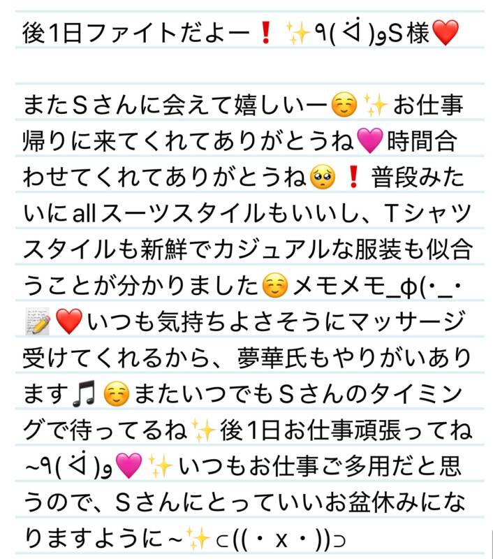 12日 後1日ファイトだよー❗️✨٩( ᐛ )وS様❤️ 2025 8/14 夢華 2025.08.14 北陸唯一!パフォーマンスに特化した「魅せる」メンズエステ 心身ともにリラックス。非日常的な極上のひと時を貴方に… お電話でのご予約はこちら LINEでのご予約はこちら 営業時間|9:30~25:00(9:00~25:00 最終受付) 完全ご予約制ご新規様、リピーター様の事前ご予約承ります 夢華 よかったらシェアしてね! URL Copied! URL Copied! 12日 また負けた😳❗️次は手押し相撲挑みます🥺 12日 癒し愛❤️大事♡ありがとう~✨Yさん(M様)❤️ 関連記事 本日もよろしくお願いします❄️ 2026.01.29 10.17日たくさん目が合って嬉しかったです❤️✨K様❤️ 2025.10.18 25日 夢華氏まで楽しませてもらいました✨ありがとう☺️H様💟❤️ 2025.11.25 23日 今日からこの子抱きしめて寝ます💙S様❤️ 2026.01.24 4日 なんでもそつなくこなしちゃう器用なM様✨❤️ 2025.11.06 9日 今年もありがとう✨やっとタイミング合ったね☺️N様💟❤️ 2026.01.10 本日も宜しくお願いします🥰 2025.12.24 31日 この日も癒される時間をありがとう✨🍀離れ難い時どうしたらいいー?🥺K様❤️ 2025.11.03