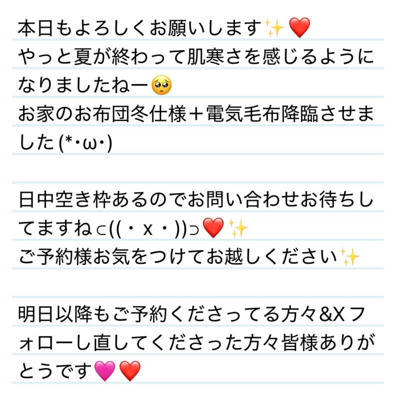 本日もよろしくお願いします🩷 2025 10/22 夢華 2025.10.22 北陸唯一!パフォーマンスに特化した「魅せる」メンズエステ 心身ともにリラックス。非日常的な極上のひと時を貴方に… お電話でのご予約はこちら LINEでのご予約はこちら 営業時間|9:30~25:00(9:00~25:00 最終受付) 完全ご予約制ご新規様、リピーター様の事前ご予約承ります 夢華 よかったらシェアしてね! URL Copied! URL Copied! 10.20いつも癒される時間をこちらこそありがとうだよー🩷✨T君❤️ 10.22 素敵な昼下がりTIMEありがとう🩷M様❤️ 関連記事 16日素敵な趣味と人柄の持ち主✨M様❤️ 2026.01.17 24日 お初目にかかります✨そうです、私が夢華氏です❤️T様❤️ 2025.12.25 25日 3度目ましても言えて嬉しい☺️✨本当にありがとう✨T様❤️ 2025.08.30 10.17日 今度はアニメトークも是非しましょう✨Y様❤️ 2025.10.18 来週もお待ちしてます❤️✨ 2026.01.24 本日もよろしくお願いします🩷 2025.11.05 4日 なんでもそつなくこなしちゃう器用なM様✨❤️ 2025.11.06 3日 ビシバシ講習が必要ですね(*´꒳`*)‼️H様💟❤️ 2025.11.04