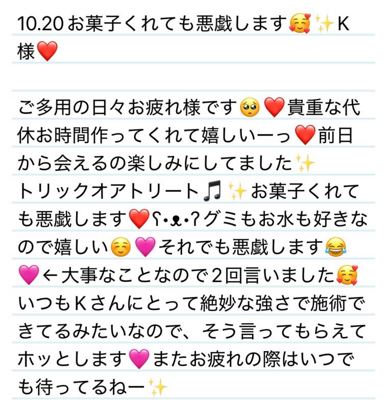 10.20お菓子をくれても悪戯します🥺✨K様❤️ 2025 10/22 夢華 2025.10.22 2025.10.22 北陸唯一!パフォーマンスに特化した「魅せる」メンズエステ 心身ともにリラックス。非日常的な極上のひと時を貴方に… お電話でのご予約はこちら LINEでのご予約はこちら 営業時間|9:30~25:00(9:00~25:00 最終受付) 完全ご予約制ご新規様、リピーター様の事前ご予約承ります 夢華 よかったらシェアしてね! URL Copied! URL Copied! 今週もよろしくお願いします✨ 10.20涙袋は恋の落とし穴⁉️🩷O君❤️ 関連記事 本日もよろしくお願いします😍💚 2025.10.27 1日 新たな扉を開いてくださりありがとう✨Kちゃん❤️ 2025.08.07 10.20涙袋は恋の落とし穴⁉️🩷O君❤️ 2025.10.22 本日もよろしくお願いします❄️ 2026.01.29 11日 ジャイアンとのび太のような関係🤣✨U様❤️ 2025.08.14 10.18いつも救ってくれるヒーローのようなW君❤️ 2025.10.20 2日 メロンもマスカットも夢華心くすぐるぜ‼️✨Y様(R君)❤️ 2025.08.07 2025年も残りわずか🥺2026年もよろしくお願いします❤️ 2025.12.27
