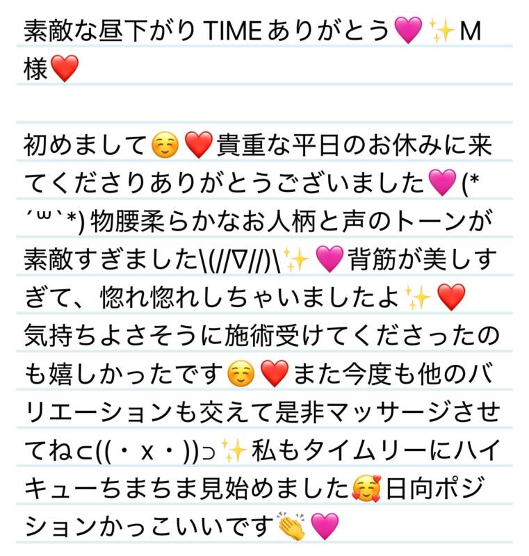10.22 素敵な昼下がりTIMEありがとう🩷M様❤️ 2025 10/23 夢華 2025.10.23 北陸唯一!パフォーマンスに特化した「魅せる」メンズエステ 心身ともにリラックス。非日常的な極上のひと時を貴方に… お電話でのご予約はこちら LINEでのご予約はこちら 営業時間|9:30~25:00(9:00~25:00 最終受付) 完全ご予約制ご新規様、リピーター様の事前ご予約承ります 夢華 よかったらシェアしてね! URL Copied! URL Copied! 本日もよろしくお願いします🩷 10.22離れ難いお時間をありがとう☺️✨Yちゃん❤️ 関連記事 26日 二度目ましてありがとう☺️また来てくださってびっくり‼️Y様❤️ 2026.01.28 今週もよろしくお願いします✨ 2025.10.20 19日 新たな扉を開いてくれてありがとう✨初めてもらっちゃった❤️✨O様❤️ 2025.08.22 12日 癒し愛❤️大事♡ありがとう~✨Yさん(M様)❤️ 2025.08.14 25日 メタモルフォーゼ💛💜また会えて嬉しい☺️N様❤️ 2025.10.26 3日 またすぐ会えて嬉しい✨🩷M様❤️ 2025.11.04 5日 あなたの心に寄り添います夢華GPT📱K様❤️ 2025.12.06 本日もよろしくお願いします🩷 2026.01.07