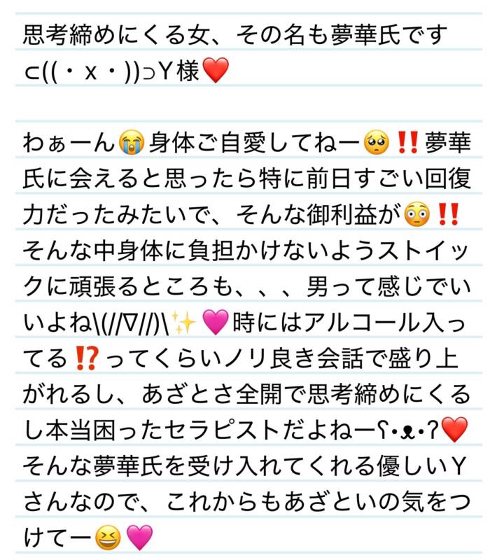 31日 思考締めにくる女、その名も夢華氏です✨Y様❤️ 2025 11/03 夢華 2025.11.03 北陸唯一!パフォーマンスに特化した「魅せる」メンズエステ 心身ともにリラックス。非日常的な極上のひと時を貴方に… お電話でのご予約はこちら LINEでのご予約はこちら 営業時間|9:30~25:00(9:00~25:00 最終受付) 完全ご予約制ご新規様、リピーター様の事前ご予約承ります 夢華 よかったらシェアしてね! URL Copied! URL Copied! 10月も本当にありがとうーーっっ✨🩷来月もよろしくお願いします🥰✨ 31日 この日も癒される時間をありがとう✨🍀離れ難い時どうしたらいいー?🥺K様❤️ 関連記事 1日 わぁーい✨待ってたよ🩷おかえりおかえり🎵T様❤️ 2025.09.02 17日 沢山お世話になっから込み上げてくるものがありました‼️✨K様❤️ 2025.12.19 25日 3度目ましても言えて嬉しい☺️✨本当にありがとう✨T様❤️ 2025.08.30 8日 今年もたくさん三姉妹と過ごしてくれてありがとう✨Y様❤️ 2025.12.09 5日 素敵な朗報ありがとうございます✨I様❤️ 2026.01.06 10.15焦らさせて癒やされて🩷T様❤️ 2025.10.17 7日 カワイイだけじゃないんです‼︎右左正面キュン死させられる⁉️M君❤️ 2025.11.08 19日 まさかのコラボ⁉️✨いつもと違ったMさんが見れて嬉しい✨🩷M様❤️ 2025.08.22