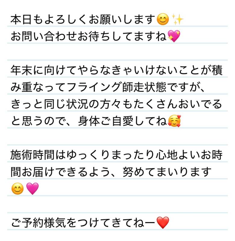 本日もよろしくお願いします❤️ 2025 11/07 夢華 2025.11.07 北陸唯一!パフォーマンスに特化した「魅せる」メンズエステ 心身ともにリラックス。非日常的な極上のひと時を貴方に… お電話でのご予約はこちら LINEでのご予約はこちら 営業時間|9:30~25:00(9:00~25:00 最終受付) 完全ご予約制ご新規様、リピーター様の事前ご予約承ります 夢華 よかったらシェアしてね! URL Copied! URL Copied! 明日からもよろしくお願いします❤️🥺 7日 カワイイだけじゃないんです‼︎右左正面キュン死させられる⁉️M君❤️ 関連記事 26日 いつまでもピュアなN君でいてください✨🩷N君❤️ 2026.01.28 10.20涙袋は恋の落とし穴⁉️🩷O君❤️ 2025.10.22 8日ほんとに初めまして⁉️フレンドリーに接してくれてありがとう😊T様❤️ 2025.08.11 8日 懐かしのシンプルブログ✨祟り神様❤️ 2025.08.11 11日 離れ難い時間をありがとう🥺O様❤️ 2025.11.13 8日 某美術館のお写真をペタリ(*・ω・)ノN君❤️ 2025.08.11 10.22 素敵な昼下がりTIMEありがとう🩷M様❤️ 2025.10.23 今日もありがとう✨❤️明日もいます✨❤️問い合わせお待ちしてますね✨ 2025.12.02