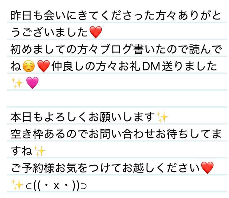 本日もよろしくお願いします❤️ 2025 11/11 夢華 2025.11.11 北陸唯一!パフォーマンスに特化した「魅せる」メンズエステ 心身ともにリラックス。非日常的な極上のひと時を貴方に… お電話でのご予約はこちら LINEでのご予約はこちら 営業時間|9:30~25:00(9:00~25:00 最終受付) 完全ご予約制ご新規様、リピーター様の事前ご予約承ります 夢華 よかったらシェアしてね! URL Copied! URL Copied! 10日 共通点も発見できて楽しすぎましたぁぁ✨T様❤️ 11日 離れ難い時間をありがとう🥺O様❤️ 関連記事 🐟11.24何の日しんちゃんへ🍚 2025.11.25 本日もよろしくお願いします♡ 2026.02.04 25日 お手本のような紳士なY様🤣✨❤️ 2025.08.30 本日もよろしくお願いします🩷 2025.10.23 14日 またお会いできてびっくり‼️😳ありがとう✨S様❤️ 2025.08.19 本日も宜しくお願いします🥰 2025.12.24 来週の夢華氏です٩( ᐛ )و 2025.12.13 来週もよろしくお願いします🩷今月も合言葉割始めました😊 2026.03.07