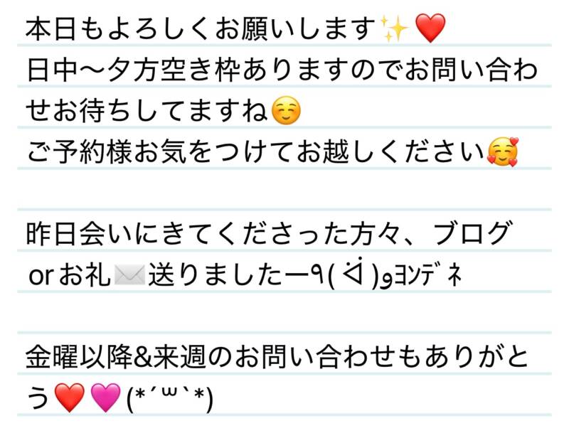 本日もよろしくお願いします✨🥰 2025 11/19 夢華 2025.11.19 北陸唯一!パフォーマンスに特化した「魅せる」メンズエステ 心身ともにリラックス。非日常的な極上のひと時を貴方に… お電話でのご予約はこちら LINEでのご予約はこちら 営業時間|9:30~25:00(9:00~25:00 最終受付) 完全ご予約制ご新規様、リピーター様の事前ご予約承ります 夢華 よかったらシェアしてね! URL Copied! URL Copied! 18日みんなのお父さん✨今月もありがとう✨❤️Y様❤️ 本日もよろしくお願いします🩷新ルームにてお待ちしてます✨ 関連記事 本日もよろしくお願いします💕オープン周年イベントスタートしてます❤️ 2026.01.14 10日 海岸線をバスは進む〜🎵byガールズルール❤️Y様❤️ 2025.11.11 10.20お菓子をくれても悪戯します🥺✨K様❤️ 2025.10.22 13日 コミュ力抜群✨無邪気なサイコパス⁉️Yちゃん❤️ 2025.12.14 今月もよろしくお願いします❤️💚 2025.12.02 19日 お疲れ様‼️✨頑張ってるの尊敬です‼️🥺Kちゃん❤️ 2025.08.22 11日 お癒し隊はいつでも駆けつけます✨🩷Kちゃん❤️ 2025.08.14 12日 急速に仲良くなれて嬉しいーっっ☺️✨Tちゃん❤️ 2025.08.14