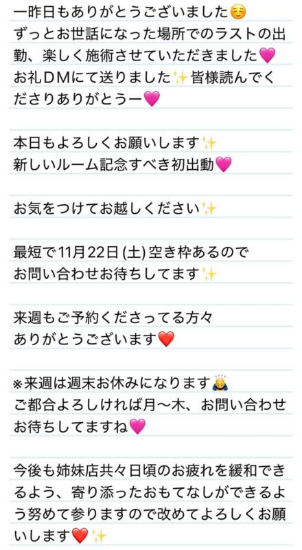 本日もよろしくお願いします🩷新ルームにてお待ちしてます✨ 2025 11/21 夢華 2025.11.21 2025.11.21 北陸唯一!パフォーマンスに特化した「魅せる」メンズエステ 心身ともにリラックス。非日常的な極上のひと時を貴方に… お電話でのご予約はこちら LINEでのご予約はこちら 営業時間|9:30~25:00(9:00~25:00 最終受付) 完全ご予約制ご新規様、リピーター様の事前ご予約承ります 夢華 よかったらシェアしてね! URL Copied! URL Copied! 本日もよろしくお願いします✨🥰 昨日もありがとうございました🩷本日もよろしくお願いします✨前半空き枠あります✨ 関連記事 本日もよろしくお願いします🩷 2025.12.14 13日 恋愛トーク楽しすぎました☺️また語りましょー🩷Y様❤️ 2025.08.14 8日 菓子折りは烏鶏庵のカステラにしましょうか⁉️🤔N君❤️ 2025.08.11 14日サンタの正体はズバリSさんですね🎄🩷⁉️ 2025.12.15 29日 こちらこそ心の癒しをありがとう✨W君❤️ 2025.12.31 31日 思考締めにくる女、その名も夢華氏です✨Y様❤️ 2025.11.03 ウ、ウワワ、ウワ🎵ちいかわ様🎄 2025.12.27 本日もよろしくお願いします❤️ 2026.01.16