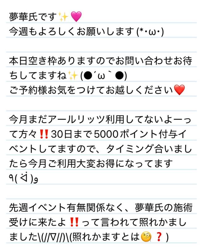 今週もよろしくお願いします❤️ 2025 12/08 夢華 2025.12.08 北陸唯一!パフォーマンスに特化した「魅せる」メンズエステ 心身ともにリラックス。非日常的な極上のひと時を貴方に… お電話でのご予約はこちら LINEでのご予約はこちら 営業時間|9:30~25:00(9:00~25:00 最終受付) 完全ご予約制ご新規様、リピーター様の事前ご予約承ります 夢華 よかったらシェアしてね! URL Copied! URL Copied! 来週の夢華氏( ˙-˙ )❤️ 8日 イジワルじゃないもん、マッサージしてるだけだもん😆←言い方w T君❤️ 関連記事 本日もよろしくお願いします🩷 2025.11.10 明日もよろしくお願いします✨来週の夢華氏✨ラーメンは一年通していつでも美味しいの三本です‼︎ 2025.11.14 本日も宜しくお願いします❤️ 2025.12.12 28日 きっかけは夢華氏🩷嬉しい新事実✨U様❤️ 2025.11.29 今週もよろしくお願いします❤️ 2025.11.24 10.17日たくさん目が合って嬉しかったです❤️✨K様❤️ 2025.10.18 本日も宜しくお願いします☺️🩷 2025.11.26 26日 嬉しい再会ありがとうございます✨アニメ好きも覚えててくれて嬉しい🩷S様❤️ 2025.08.30