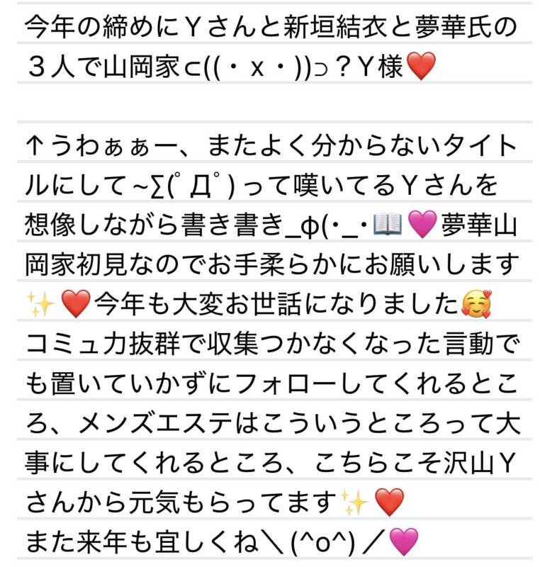 19日 今年の締めにYさんと新垣結衣と夢華氏の3人で山岡家⊂((・x・))⊃?Y様❤️ 2025 12/20 夢華 2025.12.20 北陸唯一!パフォーマンスに特化した「魅せる」メンズエステ 心身ともにリラックス。非日常的な極上のひと時を貴方に… お電話でのご予約はこちら LINEでのご予約はこちら 営業時間|9:30~25:00(9:00~25:00 最終受付) 完全ご予約制ご新規様、リピーター様の事前ご予約承ります 夢華 よかったらシェアしてね! URL Copied! URL Copied! 19日 ご先祖は天使か仏様ですか⁉️優しさの塊✨N君❤️ 関連記事 6日 今度猫じゃらし用意しとくね✨K君❤️ 2025.08.10 本日もよろしくお願いします🩷 2025.10.22 5日 全力で神様にお願いします🥺想像しただけで寂しい🥺K様❤️ 2025.12.06 15日心穏やかになれる時間をいつもありがとう✨M様❤️ 2025.11.17 12日 万全なコンディションで良かった~いつもありがとう❤️Y君(H君)❤️ 2025.08.14 明日&来週もよろしくお願いします❤️ 2025.10.24 2日 メロンもマスカットも夢華心くすぐるぜ‼️✨Y様(R君)❤️ 2025.08.07 29日 女心くすぐるものいっぱい持ってるー‼️😳Y君❤️ 2025.10.30