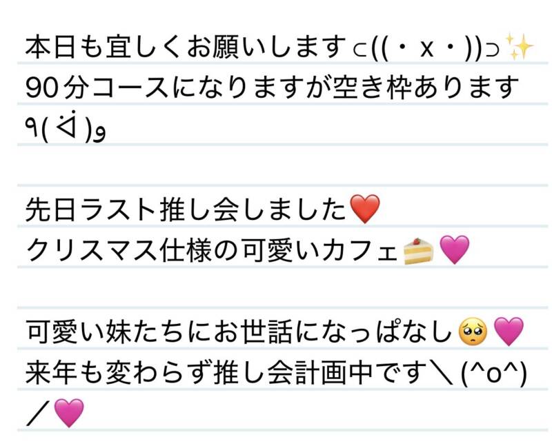 本日もよろしくお願いします✨🩷 2025 12/25 夢華 2025.12.25 北陸唯一!パフォーマンスに特化した「魅せる」メンズエステ 心身ともにリラックス。非日常的な極上のひと時を貴方に… お電話でのご予約はこちら LINEでのご予約はこちら 営業時間|9:30~25:00(9:00~25:00 最終受付) 完全ご予約制ご新規様、リピーター様の事前ご予約承ります 夢華 よかったらシェアしてね! URL Copied! URL Copied! 24日 お初目にかかります✨そうです、私が夢華氏です❤️T様❤️ ウ、ウワワ、ウワ🎵ちいかわ様🎄 関連記事 ウ、ウワワ、ウワ🎵ちいかわ様🎄 2025.12.27 本日もよろしくお願いします🩷 2025.11.10 1日 嬉しい再会✨いつでもウェルカムですʕ•ᴥ•ʔK様❤️ 2025.09.02 本日もよろしくお願いします❤️ 2026.01.16 本日もよろしくお願いします🩷 2026.01.07 25日 癒しの神様降臨⁉️✨🩷M様❤️ 2025.10.26 27日 今年中にまた会える⁉️楽しみにしてるね🩷T様❤️ 2025.11.27 11日 夢華氏お癒しモードにしてくれてありがとう🍀✨T様❤️ 2025.11.13