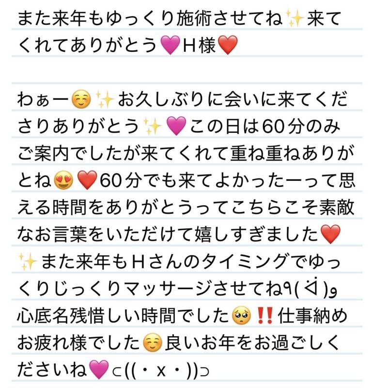 27日 また来年もゆっくり施術させてね✨来てくれてありがとう🩷H様❤️ 2025 12/28 夢華 2025.12.28 北陸唯一!パフォーマンスに特化した「魅せる」メンズエステ 心身ともにリラックス。非日常的な極上のひと時を貴方に… お電話でのご予約はこちら LINEでのご予約はこちら 営業時間|9:30~25:00(9:00~25:00 最終受付) 完全ご予約制ご新規様、リピーター様の事前ご予約承ります 夢華 よかったらシェアしてね! URL Copied! URL Copied! 2025年も残りわずか🥺2026年もよろしくお願いします❤️ 27日 明るく楽しい憎めない人柄の持ち主✨U様💟❤️ 関連記事 6日 夢華氏思い出し❤️心に残る癒しをありがとう✨Yちゃん❤️ 2026.01.07 10.18タイムリーに会いにきてくださりありがとう😳I様❤️ 2025.10.20 来週の夢華氏( ˙-˙ )❤️ 2025.12.06 8.31🍆何の日しんちゃんへ🍅 2025.08.31 26日 二度目ましてありがとう☺️また来てくださってびっくり‼️Y様❤️ 2026.01.28 14日 米✖️麺、おじやうどんなら検索したら出てきました🤣Yちゃん❤️ 2025.08.19 8日 茶目っ気がすぎるよ😆ネーミングセンス抜群のY様💟❤️ 2025.11.10 本日もよろしくおねがいします✨❤️ 2025.12.09