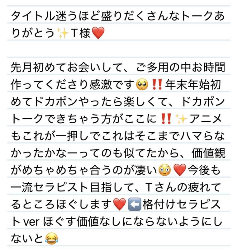 6日 タイトル迷うほど盛りだくさんなトークありがとう✨T様❤️ 2026 1/07 夢華 2026.01.07 北陸唯一!パフォーマンスに特化した「魅せる」メンズエステ 心身ともにリラックス。非日常的な極上のひと時を貴方に… お電話でのご予約はこちら LINEでのご予約はこちら 営業時間|9:30~25:00(9:00~25:00 最終受付) 完全ご予約制ご新規様、リピーター様の事前ご予約承ります 夢華 よかったらシェアしてね! URL Copied! URL Copied! 5日 素敵な朗報ありがとうございます✨I様❤️ 6日 夢華氏思い出し❤️心に残る癒しをありがとう✨Yちゃん❤️ 関連記事 16日 頑張って受身になってくれてありがとう✨😊Y様💟❤️ 2026.01.17 明日もよろしくお願いします✨来週の夢華氏✨ラーメンは一年通していつでも美味しいの三本です‼︎ 2025.11.14 5日 日中でも夜でもいつでもウェルカムです✨❤️O様❤️ 2025.12.06 31日 いっぱいお話聞いてくれてありがとう🥰安心と信頼のP様(H様)❤️ 2025.08.31 27日 いつもありがとう🥰心のこもった差し入れも嬉しいです✨N様❤️ 2025.10.29 4日いつもまったり癒される時間をありがとう🍀✨I様❤️ 2025.11.06 27日 またまたまさかの共通点‼️😳運命共同体だよー✨T様❤️ 2025.11.27 27日 新しい場所でも変わらず癒しをありがとう✨I様❤️ 2025.11.27