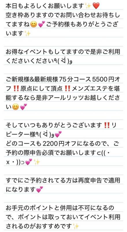 本日もよろしくお願いします💕オープン周年イベントスタートしてます❤️ 2026 1/14 夢華 2026.01.14 北陸唯一!パフォーマンスに特化した「魅せる」メンズエステ 心身ともにリラックス。非日常的な極上のひと時を貴方に… お電話でのご予約はこちら LINEでのご予約はこちら 営業時間|9:30~25:00(9:00~25:00 最終受付) 完全ご予約制ご新規様、リピーター様の事前ご予約承ります 夢華 よかったらシェアしてね! URL Copied! URL Copied! 12日 美肌所持違反で捕まえちゃうところでした☺️💕T様❤️ 14日 いつもお疲れ様😊マッサージ聞いたみたいで何よりです✨F様💟❤️ 関連記事 10.17日 どうしよう❤️嬉しいが止まらない✨I様❤️ 2025.10.18 15日心穏やかになれる時間をいつもありがとう✨M様❤️ 2025.11.17 10月も本当にありがとうーーっっ✨🩷来月もよろしくお願いします🥰✨ 2025.10.31 8日 茶目っ気がすぎるよ😆ネーミングセンス抜群のY様💟❤️ 2025.11.10 5日 全力で神様にお願いします🥺想像しただけで寂しい🥺K様❤️ 2025.12.06 昨日もありがとうございました🩷本日もよろしくお願いします✨前半空き枠あります✨ 2025.11.22 23日 やぁぁっと会えたね✨会えなかっな分まで多幸感🍀ありがとう✨I様❤️ 2025.08.25 11日 お癒し隊はいつでも駆けつけます✨🩷Kちゃん❤️ 2025.08.14