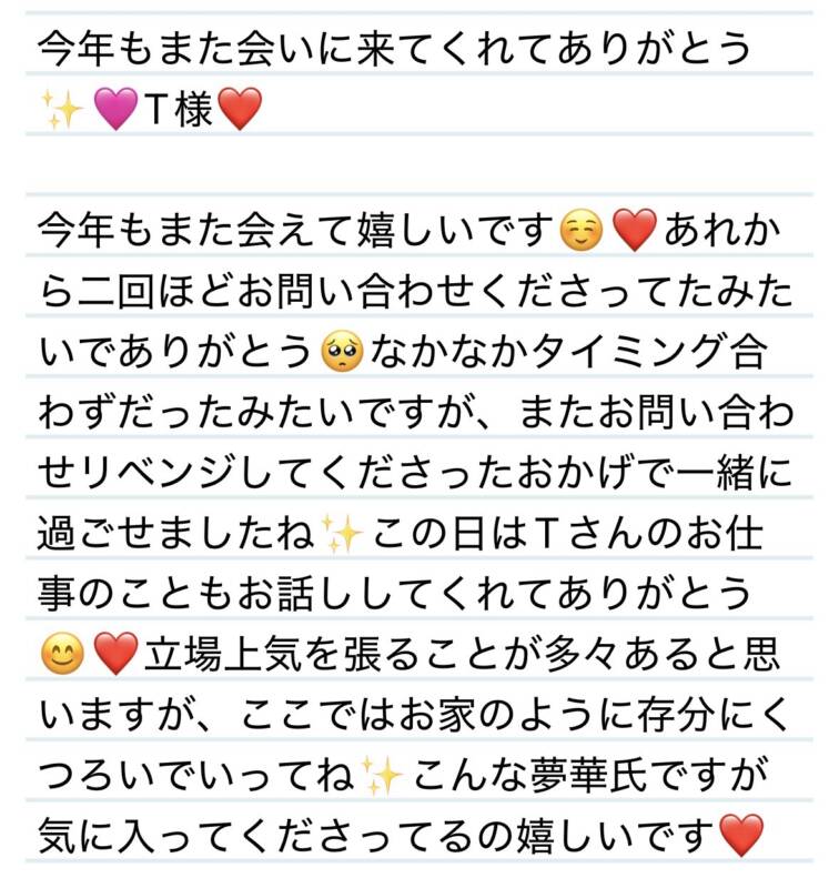 14日 今年もまた会いに来てくれてありがとう✨T様❤️ 2026 1/16 夢華 2026.01.16 北陸唯一!パフォーマンスに特化した「魅せる」メンズエステ 心身ともにリラックス。非日常的な極上のひと時を貴方に… お電話でのご予約はこちら LINEでのご予約はこちら 営業時間|9:30~25:00(9:00~25:00 最終受付) 完全ご予約制ご新規様、リピーター様の事前ご予約承ります 夢華 よかったらシェアしてね! URL Copied! URL Copied! 14日 いつもお疲れ様😊マッサージ聞いたみたいで何よりです✨F様💟❤️ 14日 素敵な受身体制、セラピストにとって1番嬉しいですね✨D様❤️ 関連記事 1日 またT君に会えて嬉しいぃぃ感動の再会⭐️T君❤️ 2025.08.07 24日オアシスのようなお癒しタイムをありがとう✨❤️I君❤️ 2026.01.26 明日もよろしくお願いします❤️ 2025.11.25 1日 嬉しい再会✨いつでもウェルカムですʕ•ᴥ•ʔK様❤️ 2025.09.02 30日 選んでくれてありがとう✨綾鷹と呼んでください🥰H様❤️ 2025.10.31 12日 またお疲れの際は是非マッサージさせてね❤️A様✨❤️ 2025.12.13 本日も宜しくお願いします❤️ 2025.12.12 31日 本当に120分経った⁉️ってくらいあっという間😳S様❤️ 2025.08.31