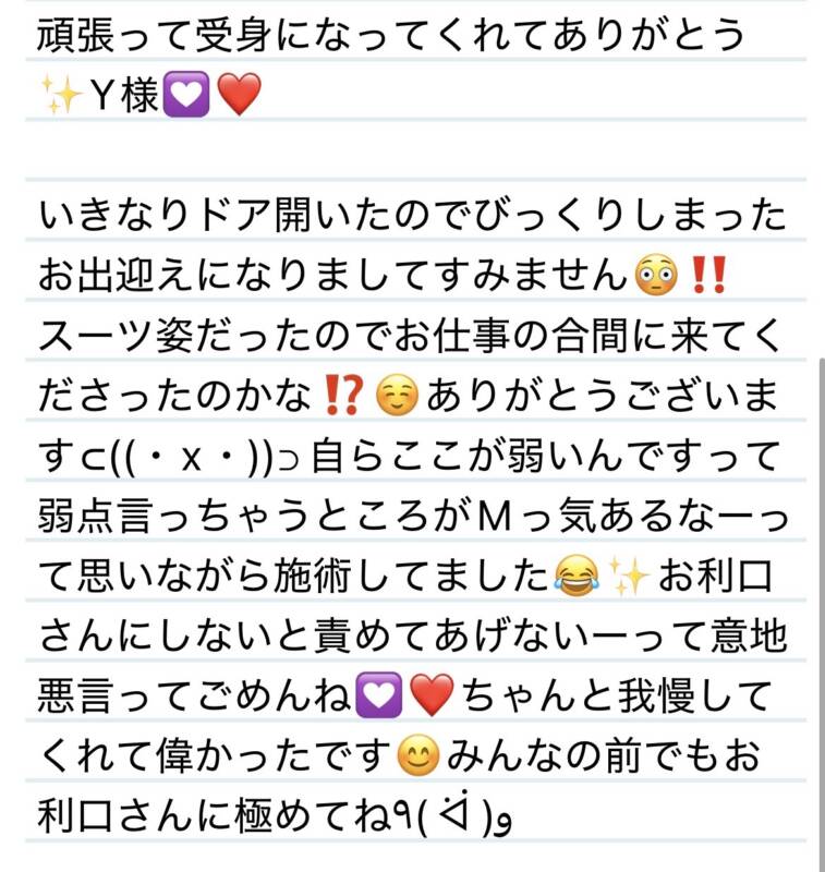 16日 頑張って受身になってくれてありがとう✨😊Y様💟❤️ 2026 1/17 夢華 2026.01.17 北陸唯一!パフォーマンスに特化した「魅せる」メンズエステ 心身ともにリラックス。非日常的な極上のひと時を貴方に… お電話でのご予約はこちら LINEでのご予約はこちら 営業時間|9:30~25:00(9:00~25:00 最終受付) 完全ご予約制ご新規様、リピーター様の事前ご予約承ります 夢華 よかったらシェアしてね! URL Copied! URL Copied! 16日素敵な趣味と人柄の持ち主✨M様❤️ 16日優しさの塊✨素敵なお心遣いに感激しました🩷K様❤️ 関連記事 22日 M-1後のモヤっと感がおかげで晴れました☀️✨Yちゃん❤️ 2025.12.24 31日 思考締めにくる女、その名も夢華氏です✨Y様❤️ 2025.11.03 本日もよろしくお願いします🩷 2026.01.17 14日 今年もまた会いに来てくれてありがとう✨T様❤️ 2026.01.16 28日 夢華氏年越し✨今年もお仕事お疲れ様でした🩷M様💟❤️ 2025.12.29 本日もよろしくお願いします🩷 2026.01.07 10日 いつもハートフルな気持ちにさせてくれてありがとう😊✨🍀T様❤️ 2025.08.12 本日もよろしくお願いします🩷 2025.10.23
