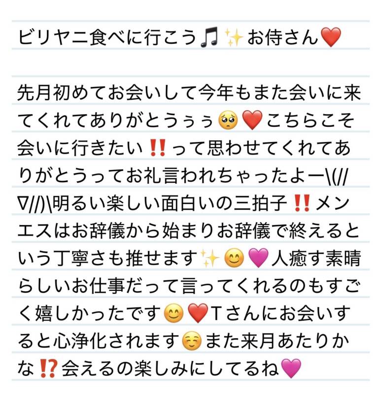 23日 ビリヤニ食べに行こう🎵✨お侍さん❤️ 2026 1/24 夢華 2026.01.24 北陸唯一!パフォーマンスに特化した「魅せる」メンズエステ 心身ともにリラックス。非日常的な極上のひと時を貴方に… お電話でのご予約はこちら LINEでのご予約はこちら 営業時間|9:30~25:00(9:00~25:00 最終受付) 完全ご予約制ご新規様、リピーター様の事前ご予約承ります 夢華 よかったらシェアしてね! URL Copied! URL Copied! 23日 今日からこの子抱きしめて寝ます💙S様❤️ 来週もお待ちしてます❤️✨ 関連記事 27日 夢華と田中みな実さんとYさんの3人で王将行く話😆Y様❤️ 2025.11.27 本日もよろしくお願いします✨🩷 2025.11.25 12日 またお疲れの際は是非マッサージさせてね❤️A様✨❤️ 2025.12.13 23日 どーも、仲介者です🤣🩷また会えて嬉しい❤️O様❤️ 2025.10.24 今週もよろしくお願いします🩷 2025.11.17 12日 推しが一緒で嬉しいーー💕✨Yちゃん❤️ 2026.01.14 2日 めっちゃ久しぶりでびっくりしたぁぁぁ✨Sちゃん❤️ 2025.08.07 本日もよろしくお願いします❤️ 2026.01.10