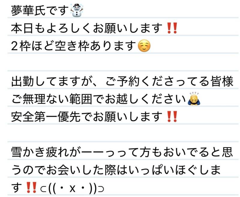本日もよろしくお願いします‼️ 2026 1/26 夢華 2026.01.26 北陸唯一!パフォーマンスに特化した「魅せる」メンズエステ 心身ともにリラックス。非日常的な極上のひと時を貴方に… お電話でのご予約はこちら LINEでのご予約はこちら 営業時間|9:30~25:00(9:00~25:00 最終受付) 完全ご予約制ご新規様、リピーター様の事前ご予約承ります 夢華 よかったらシェアしてね! URL Copied! URL Copied! 24日オアシスのようなお癒しタイムをありがとう✨❤️I君❤️ 26日 二度目ましてありがとう☺️また来てくださってびっくり‼️Y様❤️ 関連記事 本日もよろしくお願いします😍💚 2025.10.27 5日 あなたの心に寄り添います夢華GPT📱K様❤️ 2025.12.06 23日 声も雰囲気といつもお優しい❤️✨I様❤️ 2025.08.25 本日もよろしくお願いします❤️ 2025.10.29 本日もよろしくお願いします🩷 2025.08.11 25日 癒しの神様降臨⁉️✨🩷M様❤️ 2025.10.26 明日からもよろしくお願いします❤️🥺 2025.11.06 今週もよろしくお願いします✨ 2025.10.20