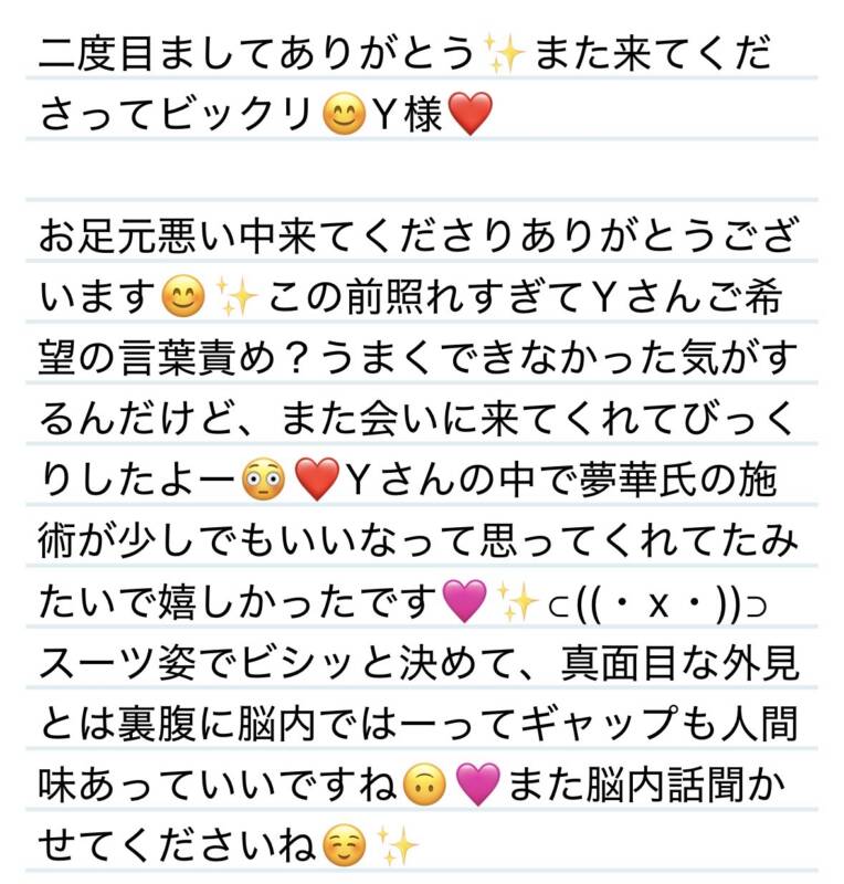 26日 二度目ましてありがとう☺️また来てくださってびっくり‼️Y様❤️ 2026 1/28 夢華 2026.01.28 北陸唯一!パフォーマンスに特化した「魅せる」メンズエステ 心身ともにリラックス。非日常的な極上のひと時を貴方に… お電話でのご予約はこちら LINEでのご予約はこちら 営業時間|9:30~25:00(9:00~25:00 最終受付) 完全ご予約制ご新規様、リピーター様の事前ご予約承ります 夢華 よかったらシェアしてね! URL Copied! URL Copied! 本日もよろしくお願いします‼️ 26日 いつまでもピュアなN君でいてください✨🩷N君❤️ 関連記事 19日 心地よい空間作りがうますぎるよ~👏癒されました🩷M様❤️ 2025.08.22 6日 タイトル迷うほど盛りだくさんなトークありがとう✨T様❤️ 2026.01.07 5日 改めて今年もよろしくお願いします✨S様❤️ 2026.01.06 20日 夢華氏の好きなものに寄り添ってくれるの嬉しいです❤️✨S様❤️ 2025.08.23 12日 またお疲れの際は是非マッサージさせてね❤️A様✨❤️ 2025.12.13 17日 沢山お世話になっから込み上げてくるものがありました‼️✨K様❤️ 2025.12.19 本日もよろしくお願いします❤️ 2026.01.09 15日心穏やかになれる時間をいつもありがとう✨M様❤️ 2025.11.17
