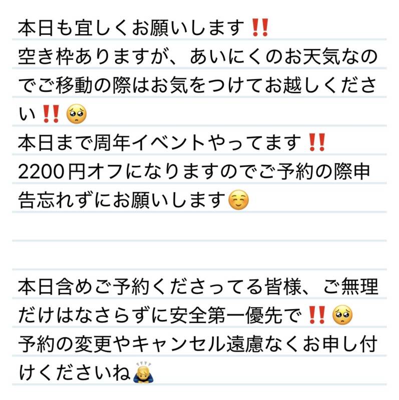 本日もよろしくお願いします❄️ 2026 1/29 夢華 2026.01.29 北陸唯一!パフォーマンスに特化した「魅せる」メンズエステ 心身ともにリラックス。非日常的な極上のひと時を貴方に… お電話でのご予約はこちら LINEでのご予約はこちら 営業時間|9:30~25:00(9:00~25:00 最終受付) 完全ご予約制ご新規様、リピーター様の事前ご予約承ります 夢華 よかったらシェアしてね! URL Copied! URL Copied! 28日 ピンクポリス代表はやはり麗子さんですね‼️✨N様❤️ 関連記事 8日 今年もたくさん三姉妹と過ごしてくれてありがとう✨Y様❤️ 2025.12.09 本日もよろしくお願いします❤️ 2025.11.07 30日 カルシウムも糖分もばっちり捕球できました✨R君❤️ 2025.08.31 明日&来週もよろしくお願いします❤️ 2025.10.24 20日 いつも身を任せてくれる嬉しさ😊❤️本当にありがとう✨W君❤️ 2025.08.23 16日会話のテンポが素晴らしい✨心のツボ押してくれてありがとう❤️Yちゃん❤️ 2026.01.19 本日もよろしくお願いします🩷 2025.11.05 5日 またUさんのこと色々知れて嬉しい☺️✨U様❤️ 2026.01.06