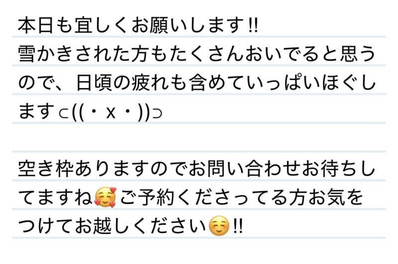 本日も宜しくお願いします❄️ 2026 1/30 夢華 2026.01.30 北陸唯一!パフォーマンスに特化した「魅せる」メンズエステ 心身ともにリラックス。非日常的な極上のひと時を貴方に… お電話でのご予約はこちら LINEでのご予約はこちら 営業時間|9:30~25:00(9:00~25:00 最終受付) 完全ご予約制ご新規様、リピーター様の事前ご予約承ります 夢華 よかったらシェアしてね! URL Copied! URL Copied! 本日もよろしくお願いします❄️ 29日 一緒に銀河鉄道🌌行っちゃったね🎵29社長様❤️ 関連記事 6日 今度猫じゃらし用意しとくね✨K君❤️ 2025.08.10 31日 雪も溶けそうなくらい熱い視線をありがとう❤️K様💟❤️ 2026.02.02 25日 癒しの神様降臨⁉️✨🩷M様❤️ 2025.10.26 本日もよろしくお願いします‼️ 2026.01.26 30日 これぞまさにDestiny⁉️❤️T様❤️ 2026.01.31 明日&来週もよろしくお願いします❤️ 2025.10.24 本日もよろしくお願いします❤️&来週の夢華氏⊂((・x・))⊃ 2026.01.31 本日もよろしくおねがいします✨❤️ 2025.12.09