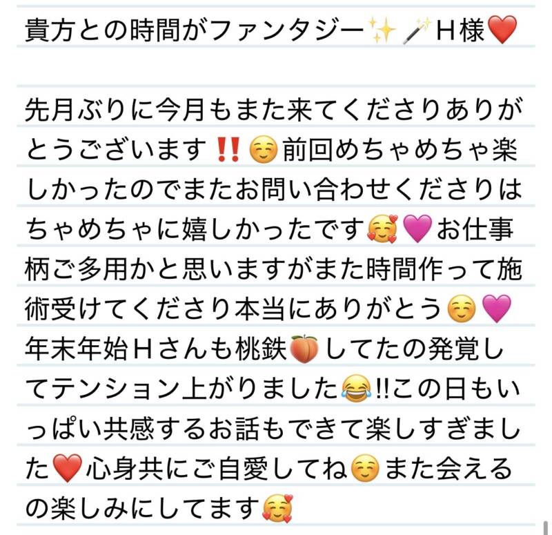 30日 貴方との時間がファンタジー✨🪄H様❤️ 2026 1/31 夢華 2026.01.31 北陸唯一!パフォーマンスに特化した「魅せる」メンズエステ 心身ともにリラックス。非日常的な極上のひと時を貴方に… お電話でのご予約はこちら LINEでのご予約はこちら 営業時間|9:30~25:00(9:00~25:00 最終受付) 完全ご予約制ご新規様、リピーター様の事前ご予約承ります 夢華 よかったらシェアしてね! URL Copied! URL Copied! 30日 これぞまさにDestiny⁉️❤️T様❤️ 本日もよろしくお願いします❤️&来週の夢華氏⊂((・x・))⊃ 関連記事 3日 甘やかさないで厳しくどうぞ‼️(*・ω・)ノM様❤️ 2025.11.04 22日ANNIVERSARY✨ちょっと早いけどおめでとう㊗️Nさん(H様)❤️ 2025.08.23 2026年もよろしくお願いします✨ 2026.01.05 5日 改めて今年もよろしくお願いします✨S様❤️ 2026.01.06 1日 新たな扉を開いてくださりありがとう✨Kちゃん❤️ 2025.08.07 本日もありがとです✨ 2025.12.15 本日もよろしくお願いします❤️ 2026.01.20 22日 もしも同じ学校だったら学食一緒に食べよー❤️✨T君❤️ 2025.08.23