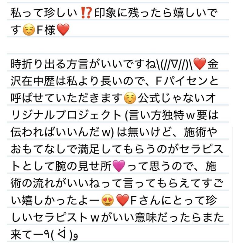 2日 私って珍しい⁉️印象に残ったら嬉しいです❤️F様❤️ 2026 2/03 夢華 2026.02.03 北陸唯一!パフォーマンスに特化した「魅せる」メンズエステ 心身ともにリラックス。非日常的な極上のひと時を貴方に… お電話でのご予約はこちら LINEでのご予約はこちら 営業時間|9:30~25:00(9:00~25:00 最終受付) 完全ご予約制ご新規様、リピーター様の事前ご予約承ります 夢華 よかったらシェアしてね! URL Copied! URL Copied! 2日 一緒に生誕祭味わえて嬉しいー✨スンスンおめでとう🎉S様❤️ 2日 Zと夢華のなまごろし⁉️近日映画公開🎞️⁉️Z様❤️ 関連記事 7日 カワイイだけじゃないんです‼︎右左正面キュン死させられる⁉️M君❤️ 2025.11.08 9日 やっぱり貴方は憧れのポケモンマスター様✨❤️H君❤️ 2025.12.10 5日 初々しさが母性くすぐります🩷✨🍀I君❤️ 2025.11.06 14日 またお会いできてびっくり‼️😳ありがとう✨S様❤️ 2025.08.19 10日 共通点も発見できて楽しすぎましたぁぁ✨T様❤️ 2025.11.11 1日 わぁーい✨待ってたよ🩷おかえりおかえり🎵T様❤️ 2025.09.02 2日 めっちゃ久しぶりでびっくりしたぁぁぁ✨Sちゃん❤️ 2025.08.07 5日 甘い香りに誘われて✨いい香りがすぎる✨K君❤️ 2025.11.06