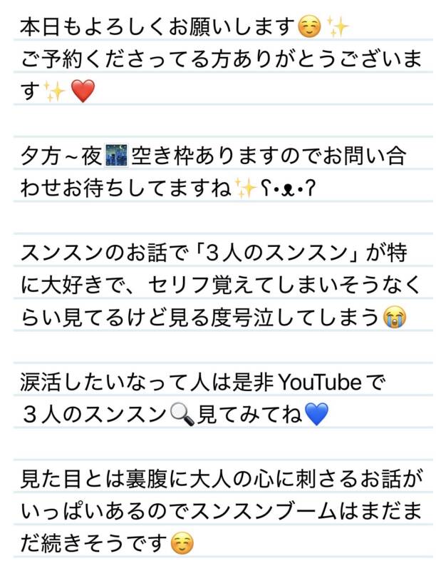 本日もよろしくお願いします💙 2026 2/06 夢華 2026.02.06 北陸唯一!パフォーマンスに特化した「魅せる」メンズエステ 心身ともにリラックス。非日常的な極上のひと時を貴方に… お電話でのご予約はこちら LINEでのご予約はこちら 営業時間|9:30~25:00(9:00~25:00 最終受付) 完全ご予約制ご新規様、リピーター様の事前ご予約承ります 夢華 よかったらシェアしてね! URL Copied! URL Copied! 本日もよろしくお願いします♡ 4日 いつもほっこりした気持ちにさせてくれてありがとう✨I様❤️ 関連記事 30日 貴方との時間がファンタジー✨🪄H様❤️ 2026.01.31 本日もよろしくお願いします🩷 2025.11.05 11日 夢華氏お癒しモードにしてくれてありがとう🍀✨T様❤️ 2025.11.13 30日 カルシウムも糖分もばっちり捕球できました✨R君❤️ 2025.08.31 26日 今度Kちゃんの男前なところについて討論しよ✨Kちゃん❤️ 2025.08.30 8日 茶目っ気がすぎるよ😆ネーミングセンス抜群のY様💟❤️ 2025.11.10 8日 菓子折りは烏鶏庵のカステラにしましょうか⁉️🤔N君❤️ 2025.08.11 19日 安定の癒しボイスと美しい手に惚れ惚れしてます✨Y君❤️ 2025.12.20