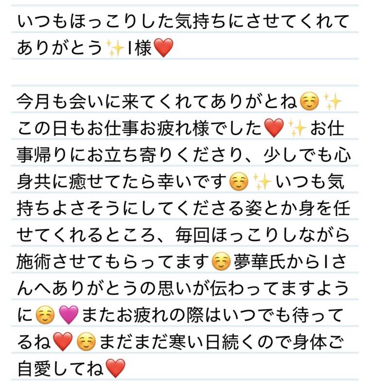 4日 いつもほっこりした気持ちにさせてくれてありがとう✨I様❤️ 2026 2/06 夢華 2026.02.06 北陸唯一!パフォーマンスに特化した「魅せる」メンズエステ 心身ともにリラックス。非日常的な極上のひと時を貴方に… お電話でのご予約はこちら LINEでのご予約はこちら 営業時間|9:30~25:00(9:00~25:00 最終受付) 完全ご予約制ご新規様、リピーター様の事前ご予約承ります 夢華 よかったらシェアしてね! URL Copied! URL Copied! 本日もよろしくお願いします💙 4日 夢華氏お癒しできたみたいで何よりです✨O様❤️ 関連記事 12日 推しが一緒で嬉しいーー💕✨Yちゃん❤️ 2026.01.14 31日みんなをハッピーな気持ちにさせる天才🍀ちいかわ様❤️ 2025.11.03 23日 やぁぁっと会えたね✨会えなかっな分まで多幸感🍀ありがとう✨I様❤️ 2025.08.25 本日もよろしくお願いします❤️ 2026.01.20 本日もよろしくお願いします💙 2026.02.06 1日 新たな扉を開いてくださりありがとう✨Kちゃん❤️ 2025.08.07 1日 夢華氏夜更かしご一緒してくれてありがとう✨🩷C様❤️ 2025.08.07 19日 安定の癒しボイスと美しい手に惚れ惚れしてます✨Y君❤️ 2025.12.20