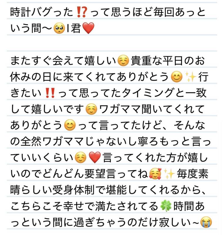 6日 時計バグった⁉️って思うほど毎回あっという間〜🥺I君❤️ 2026 2/07 夢華 2026.02.07 北陸唯一!パフォーマンスに特化した「魅せる」メンズエステ 心身ともにリラックス。非日常的な極上のひと時を貴方に… お電話でのご予約はこちら LINEでのご予約はこちら 営業時間|9:30~25:00(9:00~25:00 最終受付) 完全ご予約制ご新規様、リピーター様の事前ご予約承ります 夢華 よかったらシェアしてね! URL Copied! URL Copied! 6日今日も今日とてギャップがすごい😂✨N様❤️ 6日 夢華氏も会えて良かった😊❤️1日の締めにありがとう🩷I君❤️ 関連記事 27日 またまたまさかの共通点‼️😳運命共同体だよー✨T様❤️ 2025.11.27 4日お外も晴天、夢華氏の心も晴天なり☀️T君❤️ 2025.11.06 24日オアシスのようなお癒しタイムをありがとう✨❤️I君❤️ 2026.01.26 10.17日たくさん目が合って嬉しかったです❤️✨K様❤️ 2025.10.18 本日もよろしくお願いします💙 2026.01.06 4日 なんでもそつなくこなしちゃう器用なM様✨❤️ 2025.11.06 24日 夢ちゃんって呼んでくれるの嬉しい😊✨U様❤️ 2026.01.26 24日 先月ぶりに会えて嬉しい😊✨M様❤️ 2026.01.26