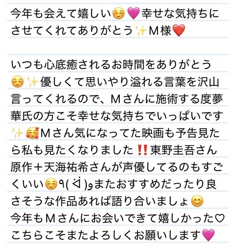 11日 今年も会えて嬉しい😊🩷幸せな気持ちにさせてくれてありがとう✨M様❤️ 2026 2/16 夢華 2026.02.16 北陸唯一!パフォーマンスに特化した「魅せる」メンズエステ 心身ともにリラックス。非日常的な極上のひと時を貴方に… お電話でのご予約はこちら LINEでのご予約はこちら 営業時間|9:30~25:00(9:00~25:00 最終受付) 完全ご予約制ご新規様、リピーター様の事前ご予約承ります 夢華 よかったらシェアしてね! URL Copied! URL Copied! 11日 今回の夢華氏はメンヘラじゃないよʕ•ᴥ•ʔ多分←⁉️M様❤️ 13日 濃厚なアニメトーク楽しすぎました✨A君❤️ 関連記事 29日 一緒に銀河鉄道🌌行っちゃったね🎵29社長様❤️ 2026.01.30 6日 今度猫じゃらし用意しとくね✨K君❤️ 2025.08.10 11日 今回の夢華氏はメンヘラじゃないよʕ•ᴥ•ʔ多分←⁉️M様❤️ 2026.02.16 10.31何の日しんちゃんへ❤️✏️📖 2025.11.03 本日もよろしくお願いします❤️ 2025.11.13 本日もよろしくお願いします❤️🎄 2025.12.03 10.17日 どうしよう❤️嬉しいが止まらない✨I様❤️ 2025.10.18 10日マッサージ欲が高い時に来てくれるの嬉しい✨T様❤️ 2025.11.11