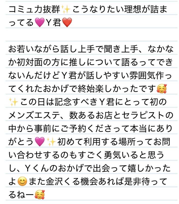 25日 コミュ力抜群✨こうなりたい理想が詰まってる🩷Y君❤️ 2026 2/27 夢華 2026.02.27 北陸唯一!パフォーマンスに特化した「魅せる」メンズエステ 心身ともにリラックス。非日常的な極上のひと時を貴方に… お電話でのご予約はこちら LINEでのご予約はこちら 営業時間|9:30~25:00(9:00~25:00 最終受付) 完全ご予約制ご新規様、リピーター様の事前ご予約承ります 夢華 よかったらシェアしてね! URL Copied! URL Copied! 25日 ブログ見てビタミンチョイスしてくれたんやね😊や.さ.し.い🥺N君❤️ 25日 次は頭もほぐすね😊また来てくれてありがとう✨T君❤️ 関連記事 本日も宜しくお願いします✨☃️お気をつけてお越しください‼️ 2025.12.05 本日もよろしくお願いします❤️ 2025.10.29 11日 今年も会えて嬉しい😊🩷幸せな気持ちにさせてくれてありがとう✨M様❤️ 2026.02.16 29日 来年も一緒に楽しく過ごそうね✨W様❤️ 2025.12.31 22日夢華クリニック🏥夢科へようこそ❤️T君❤️ 2025.08.23 10日マッサージ欲が高い時に来てくれるの嬉しい✨T様❤️ 2025.11.11 8.31🍆何の日しんちゃんへ🍅 2025.08.31 本日もよろしくお願いします🩷 2025.12.22