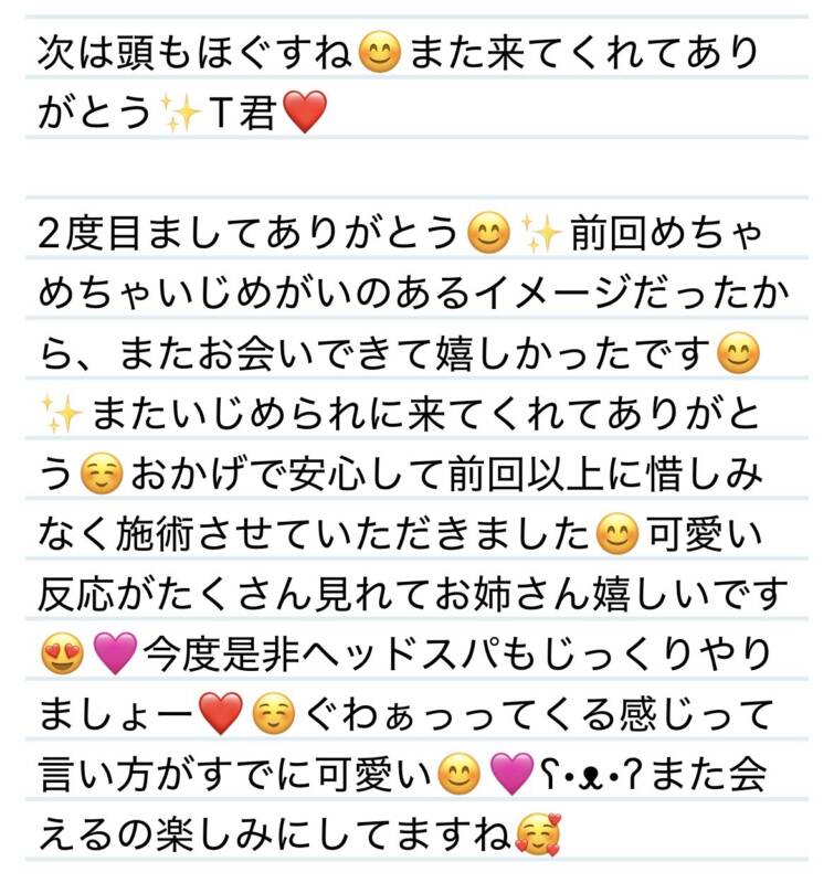 25日 次は頭もほぐすね😊また来てくれてありがとう✨T君❤️ 2026 2/27 夢華 2026.02.27 北陸唯一!パフォーマンスに特化した「魅せる」メンズエステ 心身ともにリラックス。非日常的な極上のひと時を貴方に… お電話でのご予約はこちら LINEでのご予約はこちら 営業時間|9:30~25:00(9:00~25:00 最終受付) 完全ご予約制ご新規様、リピーター様の事前ご予約承ります 夢華 よかったらシェアしてね! URL Copied! URL Copied! 25日 コミュ力抜群✨こうなりたい理想が詰まってる🩷Y君❤️ 25日 努力の塊‼️尊敬します😊✨T様❤️ 関連記事 13日 ハピバです🎉🩷いつもありがとう😊✨H君❤️ 2026.02.16 5日 かわいさ120%✨二度目まして😊Nちゃん❤️ 2025.11.06 2日 またすぐに会いに来てくれてありがとう❤️✨Y君(H君)❤️ 2025.08.07 本日もよろしくお願いします🩷新ルームにてお待ちしてます✨ 2025.11.21 本日もよろしくお願いします❤️ 2026.01.28 10.22 素敵な昼下がりTIMEありがとう🩷M様❤️ 2025.10.23 10日 いつもハートフルな気持ちにさせてくれてありがとう😊✨🍀T様❤️ 2025.08.12 25日 みんな違ってみんないい‼️✨🩷Y様❤️ 2025.08.30