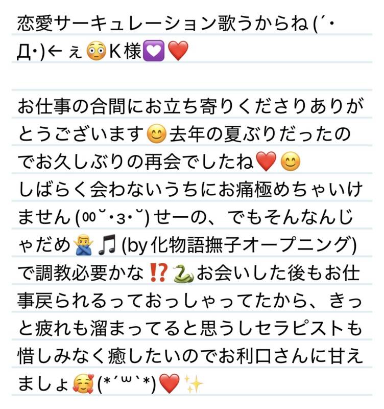 3日 恋愛サーキュレーション歌うからね(´・Д・)←ぇ😳K様❤️ 2026 3/05 夢華 2026.03.05 北陸唯一!パフォーマンスに特化した「魅せる」メンズエステ 心身ともにリラックス。非日常的な極上のひと時を貴方に… お電話でのご予約はこちら LINEでのご予約はこちら 営業時間|9:30~25:00(9:00~25:00 最終受付) 完全ご予約制ご新規様、リピーター様の事前ご予約承ります 夢華 よかったらシェアしてね! URL Copied! URL Copied! 本日も宜しくお願いします✨ 3日お雛様に因んだ差し入れもありがとう✨⊂((・x・))⊃S様❤️ 関連記事 31日 今年も会えて嬉しい✨改めてよろしくです✨H様❤️ 2026.02.02 20日 しびれさせてゴ.メ.ン⚡️🩷O様❤️ 2025.12.22 8日 某美術館のお写真をペタリ(*・ω・)ノN君❤️ 2025.08.11 21日 誰に施術するかが大事っっ✨W君❤️ 2026.02.23 5日 日中でも夜でもいつでもウェルカムです✨❤️O様❤️ 2025.12.06 5日 またUさんのこと色々知れて嬉しい☺️✨U様❤️ 2026.01.06 31日 いっぱいお話聞いてくれてありがとう🥰安心と信頼のP様(H様)❤️ 2025.08.31 今週もよろしくお願いします🙇♂️ご迷惑お掛けしました😭 2026.02.16