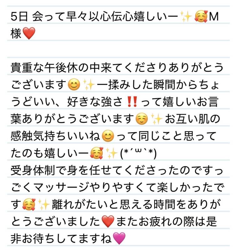 5日会って早々以心伝心嬉しいーっ✨😊M様❤️ 2026 3/06 夢華 2026.03.06 北陸唯一!パフォーマンスに特化した「魅せる」メンズエステ 心身ともにリラックス。非日常的な極上のひと時を貴方に… お電話でのご予約はこちら LINEでのご予約はこちら 営業時間|9:30~25:00(9:00~25:00 最終受付) 完全ご予約制ご新規様、リピーター様の事前ご予約承ります 夢華 よかったらシェアしてね! URL Copied! URL Copied! 5日 無限の彼方へさぁ行くぞ‼️byバズ・ライトイヤー٩( 'ω' )وN様❤️ 本日もよろしくお願いします❤️ 関連記事 今月もよろしくお願いします❤️💚 2025.12.02 10日 テトリスアプリをダウンロードしようか検討中🤔✨T君❤️ 2025.08.12 本日もありがとです✨ 2025.12.15 本日もよろしくお願いします❤️🎄 2025.12.03 20日 K君=クリーニングのK⁉️😳K君❤️ 2025.08.23 10.20涙袋は恋の落とし穴⁉️🩷O君❤️ 2025.10.22 10日 共通点も発見できて楽しすぎましたぁぁ✨T様❤️ 2025.11.11 25日嬉しい再会ありがとうございます✨K様❤️ 2026.02.27