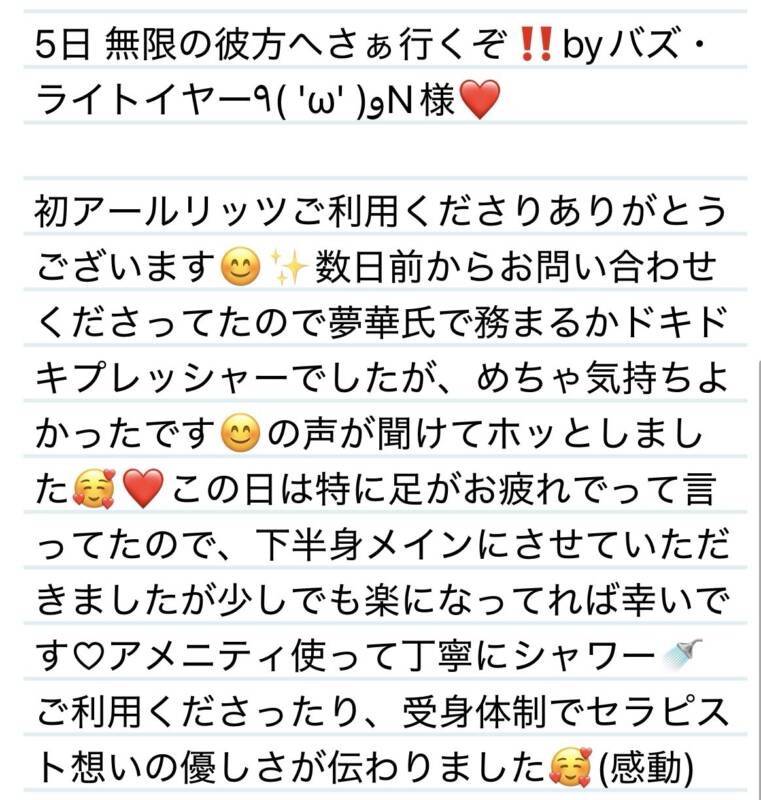 5日 無限の彼方へさぁ行くぞ‼️byバズ・ライトイヤー٩( ‘ω’ )وN様❤️ 2026 3/06 夢華 2026.03.06 北陸唯一!パフォーマンスに特化した「魅せる」メンズエステ 心身ともにリラックス。非日常的な極上のひと時を貴方に… お電話でのご予約はこちら LINEでのご予約はこちら 営業時間|9:30~25:00(9:00~25:00 最終受付) 完全ご予約制ご新規様、リピーター様の事前ご予約承ります 夢華 よかったらシェアしてね! URL Copied! URL Copied! 3日お雛様に因んだ差し入れもありがとう✨⊂((・x・))⊃S様❤️ 5日会って早々以心伝心嬉しいーっ✨😊M様❤️ 関連記事 8日ほんとに初めまして⁉️フレンドリーに接してくれてありがとう😊T様❤️ 2025.08.11 8日 茶目っ気がすぎるよ😆ネーミングセンス抜群のY様💟❤️ 2025.11.10 15日 テンション上げてくれてありがとうーーっっ✨Yちゃん❤️ 2025.11.17 22日 もしも同じ学校だったら学食一緒に食べよー❤️✨T君❤️ 2025.08.23 25日 3度目ましても言えて嬉しい☺️✨本当にありがとう✨T様❤️ 2025.08.30 29日 来年も一緒に楽しく過ごそうね✨W様❤️ 2025.12.31 8日 菓子折りは烏鶏庵のカステラにしましょうか⁉️🤔N君❤️ 2025.08.11 2026年もよろしくお願いします✨ 2026.01.05