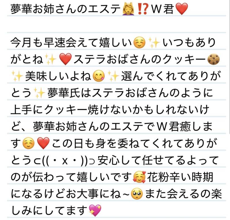 9日 夢華お姉さんのエステ💆♀️⁉️W君❤️ 2026 3/11 夢華 2026.03.11 北陸唯一!パフォーマンスに特化した「魅せる」メンズエステ 心身ともにリラックス。非日常的な極上のひと時を貴方に… お電話でのご予約はこちら LINEでのご予約はこちら 営業時間|9:30~25:00(9:00~25:00 最終受付) 完全ご予約制ご新規様、リピーター様の事前ご予約承ります 夢華 よかったらシェアしてね! URL Copied! URL Copied! 9日 お話も施術も楽しすぎました✨❤️M様❤️ 本日もよろしくお願いします✨ 関連記事 本日も宜しくお願いします☺️🩷 2025.11.26 20日 優しい雰囲気が光輝くオーラに纏われてる✨K様❤️ 2025.08.23 本日もよろしくお願いします🩷 2025.10.23 4日いつもまったり癒される時間をありがとう🍀✨I様❤️ 2025.11.06 12日 急速に仲良くなれて嬉しいーっっ☺️✨Tちゃん❤️ 2025.08.14 25日 君の愛馬がずきゅんどきゅん走りだし〜🐎🩷O君❤️ 2025.10.26 10.15日 夢柱前集中コースありがとうございます✨S様❤️ 2025.10.17 21日 誰に施術するかが大事っっ✨W君❤️ 2026.02.23