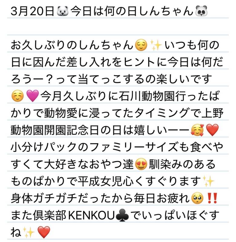 3.20🐻❄️今日は何の日しんちゃん🐻 2026 3/21 夢華 2026.03.21 北陸唯一!パフォーマンスに特化した「魅せる」メンズエステ 心身ともにリラックス。非日常的な極上のひと時を貴方に… お電話でのご予約はこちら LINEでのご予約はこちら 営業時間|9:30~25:00(9:00~25:00 最終受付) 完全ご予約制ご新規様、リピーター様の事前ご予約承ります 夢華 よかったらシェアしてね! URL Copied! URL Copied! 本日もよろしくお願いします✨ 20日 無事に帰ってきてくれてありがとう✨❤️N様(H様)❤️ 関連記事 13日 ハピバです🎉🩷いつもありがとう😊✨H君❤️ 2026.02.16 27日 また来年もゆっくり施術させてね✨来てくれてありがとう🩷H様❤️ 2025.12.28 本日もよろしくお願いします❤️🎄 2025.12.03 6日今日も今日とてギャップがすごい😂✨N様❤️ 2026.02.07 13日 おかげでいつもモチベーション上がります✨M様💟❤️ 2025.08.14 本日も宜しくお願いします❤️ 2026.02.02 27日 やぁぁっとタイミング合ったみたいでありがとう🥰N様💟❤️ 2025.10.29 14日サンタの正体はズバリSさんですね🎄🩷⁉️ 2025.12.15