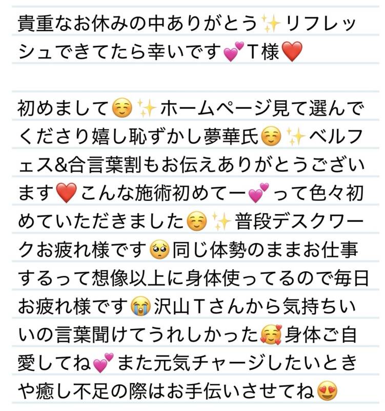 25日 貴重なお休みの中ありがとう✨リフレッシュできてたら幸いです🩷T様❤️ 2026 3/27 夢華 2026.03.27 北陸唯一!パフォーマンスに特化した「魅せる」メンズエステ 心身ともにリラックス。非日常的な極上のひと時を貴方に… お電話でのご予約はこちら LINEでのご予約はこちら 営業時間|9:30~25:00(9:00~25:00 最終受付) 完全ご予約制ご新規様、リピーター様の事前ご予約承ります 夢華 よかったらシェアしてね! URL Copied! URL Copied! ☃️3.25今日は何の日しんちゃんへ⚡️ 関連記事 19日 お疲れ様‼️✨頑張ってるの尊敬です‼️🥺Kちゃん❤️ 2025.08.22 31日みんなをハッピーな気持ちにさせる天才🍀ちいかわ様❤️ 2025.11.03 23日 珍しい時間帯にありがとう😊✨いつでもウェルカムです❤️S様❤️ 2026.02.25 7日 3日ぶり😊🩷たくさん会えて嬉しい✨I様❤️ 2025.11.08 27日 某俳優さん(アイドル)ににてるーっっ✨S君❤️ 2025.10.29 3日 恋愛サーキュレーション歌うからね(´・Д・)←ぇ😳K様❤️ 2026.03.05 6日 夢華氏も会えて良かった😊❤️1日の締めにありがとう🩷I君❤️ 2026.02.07 27日 また来年もゆっくり施術させてね✨来てくれてありがとう🩷H様❤️ 2025.12.28