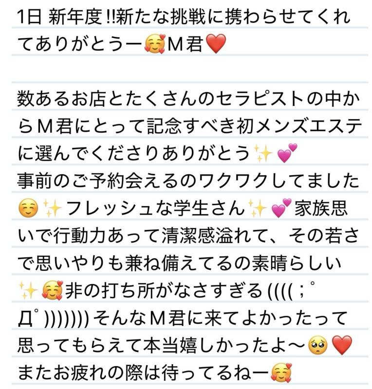 1日 新年度‼︎新たな挑戦に携わらせてくれてありがとう〜😍M君❤️ 2026 4/03 夢華 2026.04.03 北陸唯一!パフォーマンスに特化した「魅せる」メンズエステ 心身ともにリラックス。非日常的な極上のひと時を貴方に… お電話でのご予約はこちら LINEでのご予約はこちら 営業時間|9:30~25:00(9:00~25:00 最終受付) 完全ご予約制ご新規様、リピーター様の事前ご予約承ります 夢華 よかったらシェアしてね! URL Copied! URL Copied! 今月もよろしくお願いします☺️大切な皆様に再度お知らせです。 本日もよろしくお願いします❤️ 関連記事 24日 先月ぶりに会えて嬉しい😊✨M様❤️ 2026.01.26 22日 素直なお言葉が嬉しいです✨ありがとう🥰N様❤️ 2025.08.23 14日 ドキドキするお姉さん係に立候補します❤️T君❤️ 2026.03.16 16日 嬉しい再会だぁぁぁ✨ありがとう❤️S様❤️ 2026.03.17 1日 わぁーい✨待ってたよ🩷おかえりおかえり🎵T様❤️ 2025.09.02 10.18 IQまめっち並みに天才‼️W様❤️ 2025.10.20 16日優しさの塊✨素敵なお心遣いに感激しました🩷K様❤️ 2026.01.17 13日 おかげでいつもモチベーション上がります✨M様💟❤️ 2025.08.14