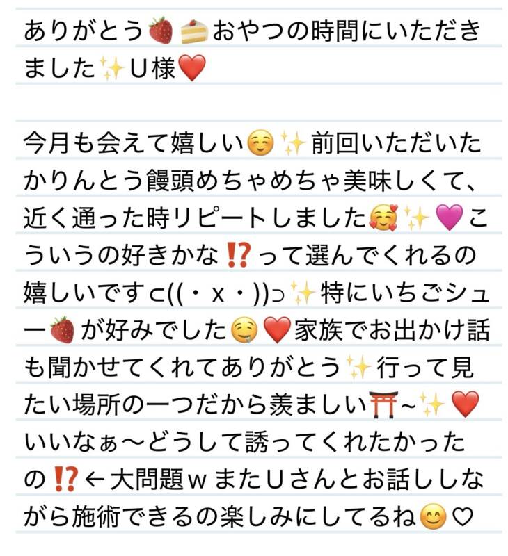 4日 ありがとう🍓🍰おやつの時間にいただきました✨U様❤️ 2026 4/07 夢華 2026.04.07 北陸唯一!パフォーマンスに特化した「魅せる」メンズエステ 心身ともにリラックス。非日常的な極上のひと時を貴方に… お電話でのご予約はこちら LINEでのご予約はこちら 営業時間|9:30~25:00(9:00~25:00 最終受付) 完全ご予約制ご新規様、リピーター様の事前ご予約承ります 夢華 よかったらシェアしてね! URL Copied! URL Copied! 3日 夢華氏のミニチュアな脳でもすごく分かりやすかった‼️✨T様❤️ 4日 happy birthday☺️✨素敵な一年になりますように✨I君❤️ 関連記事 2日 一緒に生誕祭味わえて嬉しいー✨スンスンおめでとう🎉S様❤️ 2026.02.03 12日今年もパウダー大名務めさせていただきます💟❤️Y様❤️ 2026.01.14 本日もよろしくお願いします❤️ 2025.11.13 ウ、ウワワ、ウワ🎵ちいかわ様🎄 2025.12.27 27日 またまたまさかの共通点‼️😳運命共同体だよー✨T様❤️ 2025.11.27 11日 スイーツ王子と呼ばせてください✨🩷M様❤️ 2025.08.14 9日 夢華お姉さんのエステ💆♀️⁉️W君❤️ 2026.03.11 23日 ゆめはなさんって呼び方初めて☺️←ちょっと気に入ってる🩷M様❤️ 2026.02.25