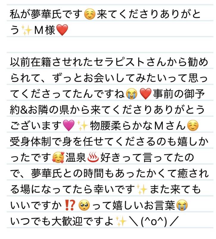 7日 私が夢華氏です☺️来てくれてありがとう✨M様❤️ 2026 4/08 夢華 2026.04.08 北陸唯一!パフォーマンスに特化した「魅せる」メンズエステ 心身ともにリラックス。非日常的な極上のひと時を貴方に… お電話でのご予約はこちら LINEでのご予約はこちら 営業時間|9:30~25:00(9:00~25:00 最終受付) 完全ご予約制ご新規様、リピーター様の事前ご予約承ります 夢華 よかったらシェアしてね! URL Copied! URL Copied! 7日 私の方がいつも癒されちゃってる☺️✨ありがとう❤️W君❤️ 関連記事 本日もよろしくお願いします❤️ 2025.11.07 6日 ズバリ、テトリスのT君✨⁉️❤️T君❤️ 2025.08.10 6日 ハンカチ、テッシュ忘れずに✨🩷サッ(*・ω・)ノ□ Nさん(H様)❤️ 2025.08.10 27日 某俳優さん(アイドル)ににてるーっっ✨S君❤️ 2025.10.29 23日 今日からこの子抱きしめて寝ます💙S様❤️ 2026.01.24 8日 2人してありがとうが止まらない平和な世界🌏✨K様❤️ 2025.08.11 本日も宜しくお願いします♡ 2025.12.15 昨日もありがとう🩷明日からもよろしくお願いします✨ 2025.10.26