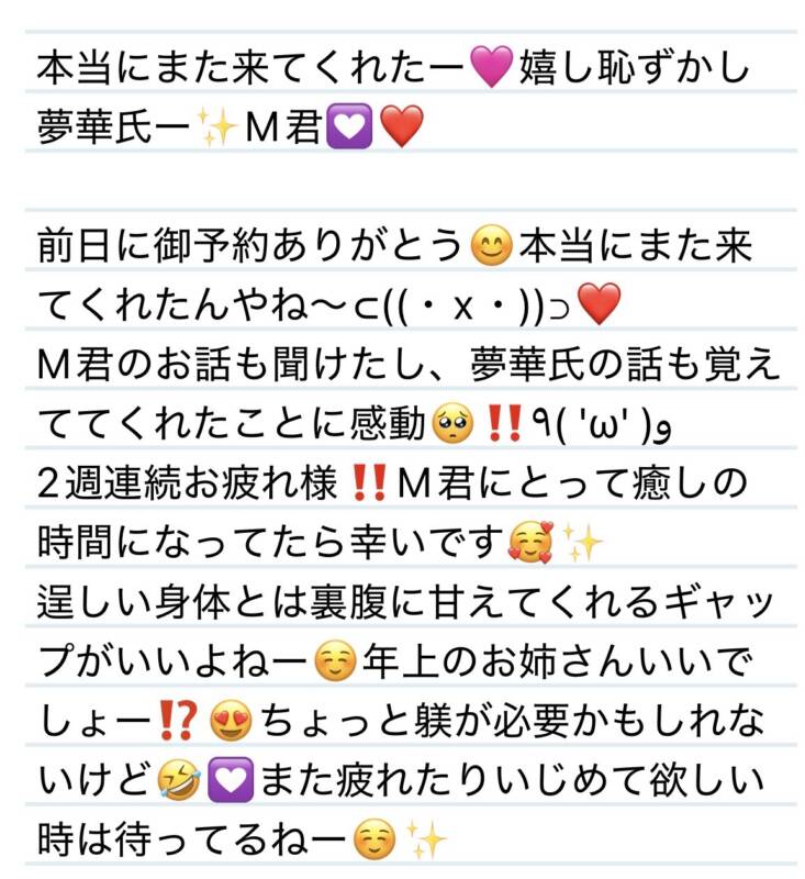8日 本当にまた来てくれたー🩷嬉し恥ずかし夢華氏✨M君💟❤️ 2026 4/10 夢華 2026.04.10 北陸唯一!パフォーマンスに特化した「魅せる」メンズエステ 心身ともにリラックス。非日常的な極上のひと時を貴方に… お電話でのご予約はこちら LINEでのご予約はこちら 営業時間|9:30~25:00(9:00~25:00 最終受付) 完全ご予約制ご新規様、リピーター様の事前ご予約承ります 夢華 よかったらシェアしてね! URL Copied! URL Copied! 8日 エグ散らかしてごめんね🩷名前エグ華に改名しようかな⁉️K様❤️ 本日もよろしくお願いします🩷 関連記事 10.17日たくさん目が合って嬉しかったです❤️✨K様❤️ 2025.10.18 9日 やっぱり貴方は憧れのポケモンマスター様✨❤️H君❤️ 2025.12.10 5日会って早々以心伝心嬉しいーっ✨😊M様❤️ 2026.03.06 23日 声も雰囲気といつもお優しい❤️✨I様❤️ 2025.08.25 本日もよろしくお願いします✨ 2026.03.11 13日 ハピバです🎉🩷いつもありがとう😊✨H君❤️ 2026.02.16 本日もよろしくお願いします💕オープン周年イベントスタートしてます❤️ 2026.01.14 13日 心のビタミン的存在✨リフレッシュできたぁ🩷F-君❤️ 2025.11.14