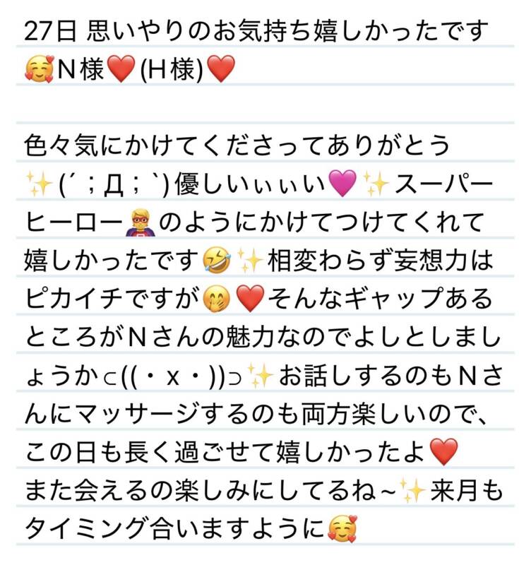 27日 思いやりのお気持ち嬉しかったです🥰N様(H様)❤️ 2026 4/30 夢華 2026.04.30 北陸唯一!パフォーマンスに特化した「魅せる」メンズエステ 心身ともにリラックス。非日常的な極上のひと時を貴方に… お電話でのご予約はこちら LINEでのご予約はこちら 営業時間|9:30~25:00(9:00~25:00 最終受付) 完全ご予約制ご新規様、リピーター様の事前ご予約承ります 夢華 よかったらシェアしてね! URL Copied! URL Copied! 26日おしゃべりシリーズ待望のノンノーン⛄️✨S様❤️ 29日 安定の優しさに包まれました✨❣️Iちゃん❤️ 関連記事 本日もよろしくお願いします❤️ 2026.03.14 25日 ブログ見てビタミンチョイスしてくれたんやね😊や.さ.し.い🥺N君❤️ 2026.02.27 28日 輸血し合えることが判明しました😊✨Yちゃん❤️ 2025.12.29 本日もよろしくお願いします✨🩷 2025.12.25 28日 久しぶりでも緊張せず話せる間柄が嬉しいーっっ🩷✨F様❤️ 2026.03.02 4日いつもまったり癒される時間をありがとう🍀✨I様❤️ 2025.11.06 27日 いつもありがとう🥰心のこもった差し入れも嬉しいです✨N様❤️ 2025.10.29 今週もよろしくお願いします✨ 2026.01.19